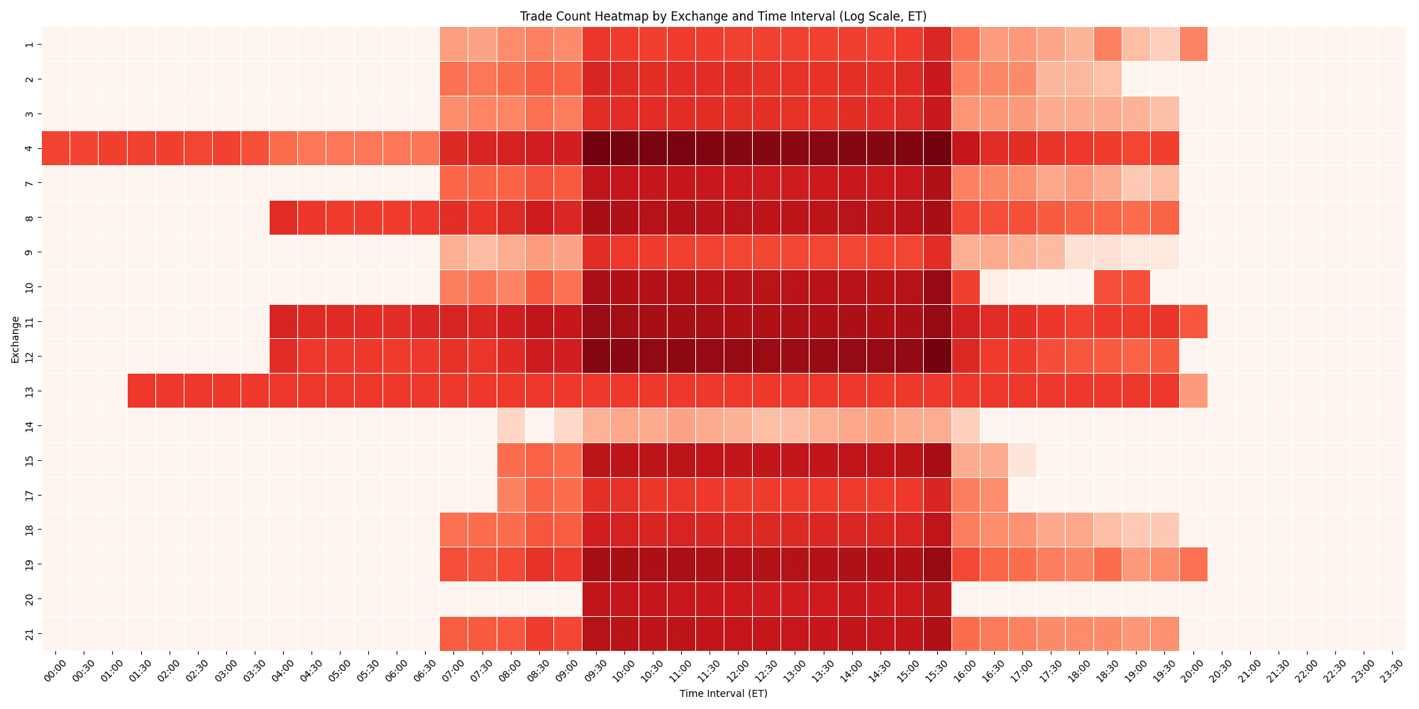 The analysis reveals much more than just the volume dominance of certain exchanges; it uncovers operational patterns and hours of operation, including earlier start times indicated by significant pre-market activity on some exchanges. Moreover, the heatmap visualization brings to light the pivotal roles of Exchanges 4 and 12, which collectively process approximately 50% of all trades, highlighting their central importance in the market's framework. These insights, from trading intensity to the strategic timing of operations across various exchanges, provide a clearer understanding of the intricate market dynamics, underlining the significance of these exchanges in facilitating a substantial portion of the day's trading activity.